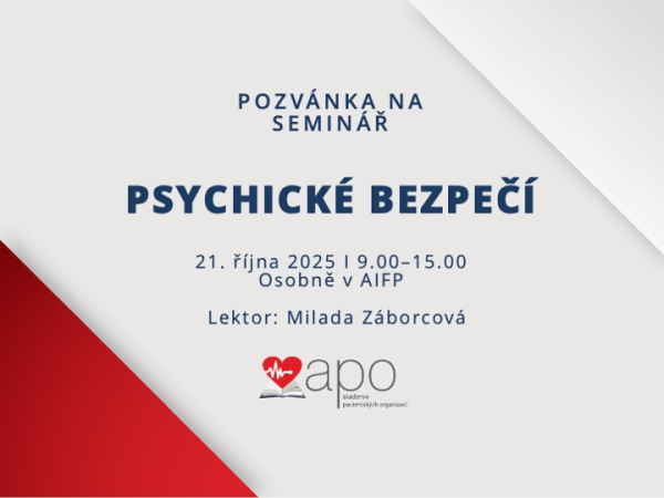 Vážení zástupci pacientských organizací, zveme vás na OSOBNÍ APO seminář na téma Psychické bezpečí. Obsah semináře: Překážka jako výzva – proč ve starém Římě byli mnohem vyrovnanější než my dnes? Co vše ve svém životě máme a nemáme pod kontrolou? Strach jako emoce, s níž můžeme pracovat Mít správný směr a vnímat smysl – proč je…