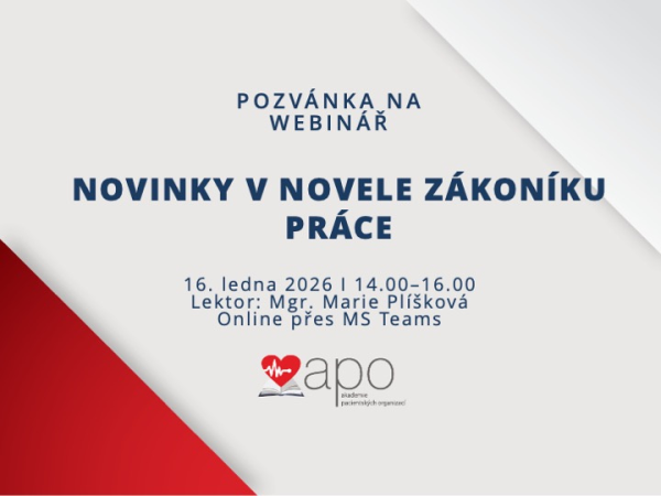 Vážení zástupci pacientských organizací, zveme vás na první APO webinář v tomto roce - Novinky v novele zákoníku práce s právničkou Marií Plíškovou. Termín: 16. ledna 2026 I 14.00-16.00 Forma: Online přes MS Teams Registrace ZDE. Po registraci Vám bude zaslán link k připojení. Na tento webinář budou navazovat ONLINE INDIVIDUÁLNÍ KONZULTACE na…