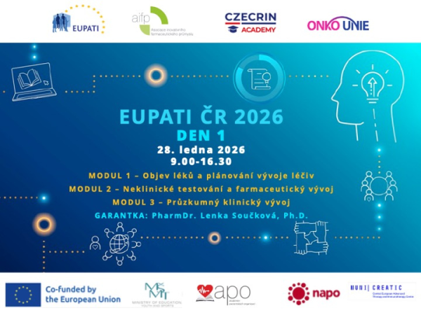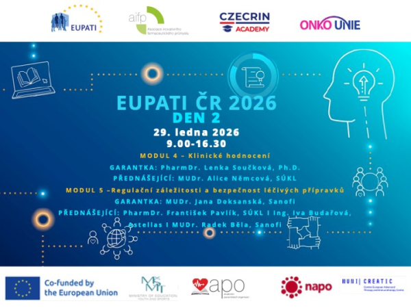 EUPATI ČR pod záštitou Ministra zdravotnictví ČR - Den 2 Modul 4 - Klinické hodnocení Garantka: PharmDr. Lenka SOUČKOVÁ, Ph.D., CZECRINDalší přednášející: MUDr. Alice NĚMCOVÁ, ředitelka Odboru klinického hodnocení léčivých přípravků ze Státního ústavu pro kontrolu léčiv (SÚKL) Modul 5 - Regulační záležitosti a bezpečnosti léčivých přípravků Garantka: MUDr. Jana DOKSANSKÁ, SanofiDalší přednášející: PharmDr. František PAVLÍK, ředitel sekce…