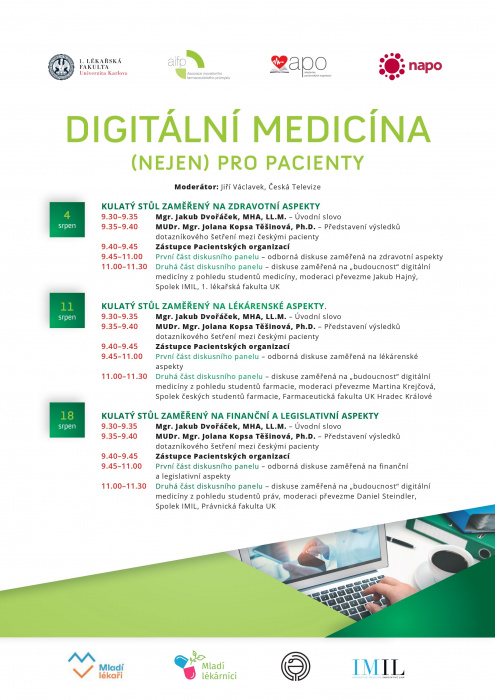 pod garancí MUDr. Mgr. Jolany Kopsa Těšinové, Ph.D. z 1. lékařské fakulty ve spolupráci s AIFP a APO probíhá dlouhodobý projekt „Digitalizace medicíny (nejen) pro pacienty“, jehož podkladem je dotazníkové šetření mezi českými pacienty. Během měsíce srpna se budou konat právnické diskuze a tři odborné kulaté stoly. Celý letní program naleznete níže.