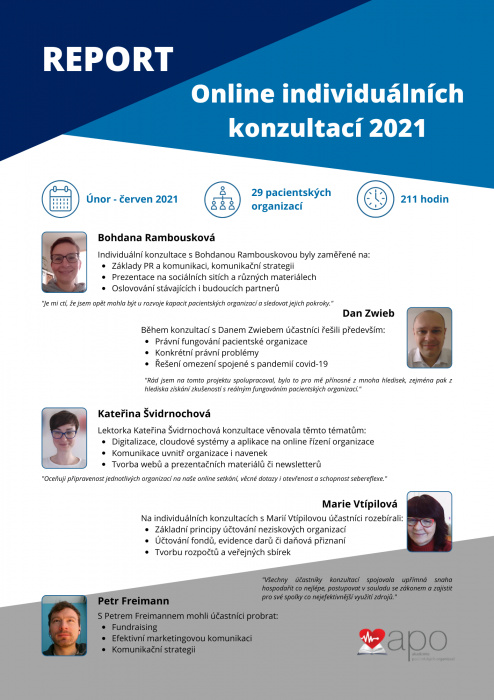 i v roce 2021 jsme se v APO věnovali individuálním konzultacím. Kvůli přetrvávající pandemii covid-19 proběhly všechny konzultace pouze online. I přes to byl o ně velký zájem. Během února až června se uskutečnilo 211 hodin, na které se připojilo 29 pacientských organizací. Celý report nalzenete níže.
